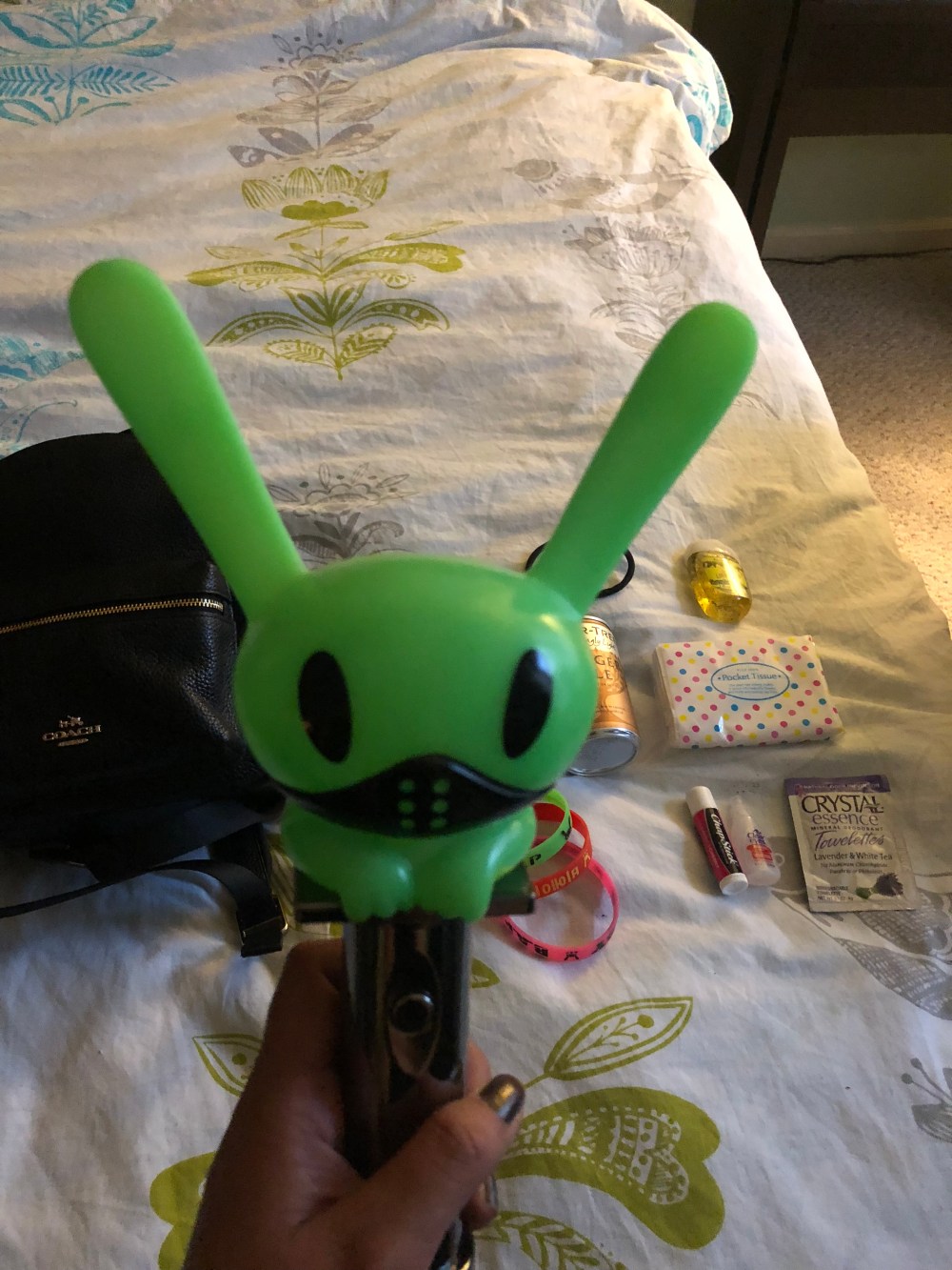 Matobong, BAP wristbands, antibacterial gel, eye drops, chapstick, hair tie, deodorant wipe, portable charger and a small drink for the long wait in line before the concert.